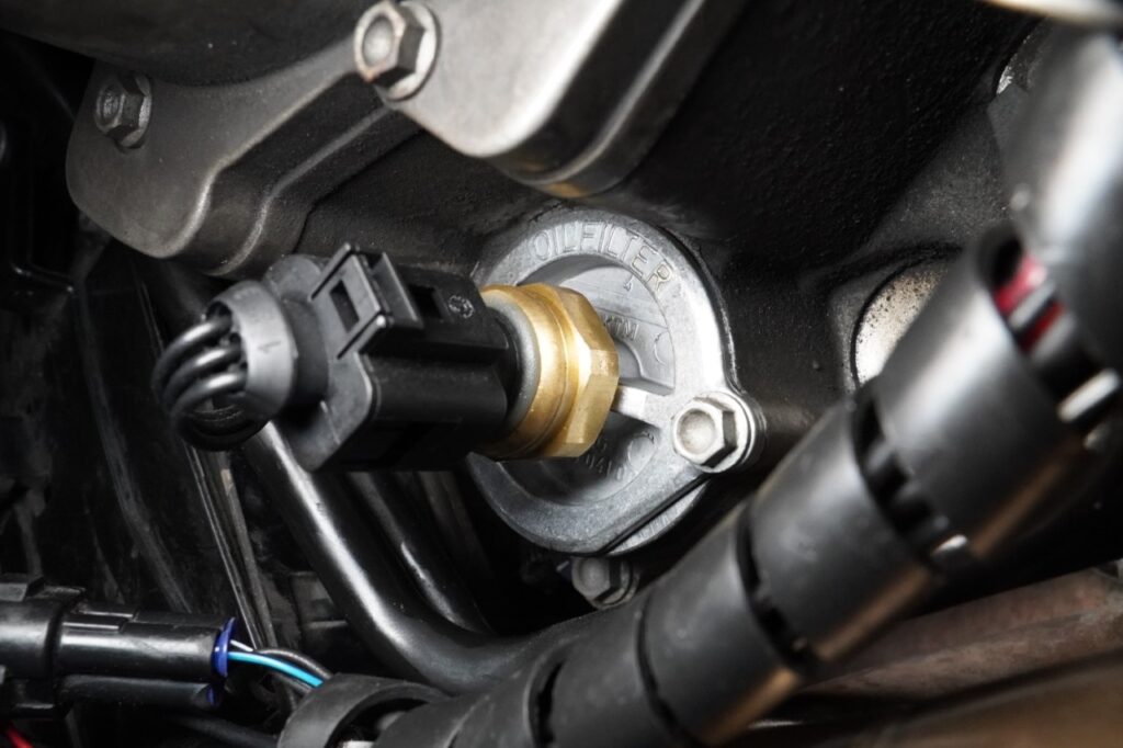 Für den LC8-Motor wählen wir den M14x1,5 Temperatursensor und installieren ihn in Fahrtrichtung vorne, unten am Motorgehäuse (Position Nr. 7), direkt am Sitz des Ölfilters. Für eine bessere Zugänglichkeit wird an der Super Duke 990 der Bugspoiler und das Batteriefach demontiert. Dann kann die originale Verschlussschaube entfernt und der M14 Temperatursensor installiert werden (Anzugsdrehmoment von 20NM beachten). Das dabei ausgelaufene Öl muss aufgefangen und die entsprechende Menge später ersetzt werden.